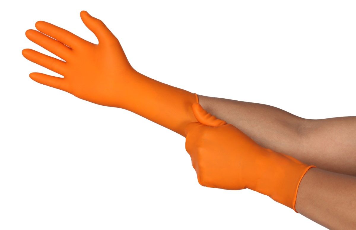 - Tuotepolku Etusivu KäsiensuojaimetKertakäyttö ja kemikaalikäsineet TOUCHNTUFF 93-800 oranssi, paksuus 0,60 mm, pituus 285 mm, 30 kpl