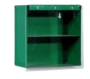 Suojalaseille tarkoitettu metallinen kaappi ylöskääntyvällä kirkkaalla muovikannella. Säilytyskaapissa on kiinteä välihylly.