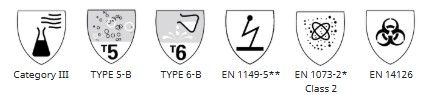 Haalari täyttää normit EN ISO 17491-4 menetelmä A, EN 14126:2003, EN 1149-5:2008, EN 1073-2:2002.